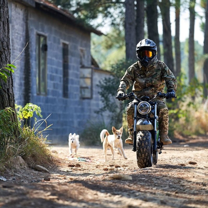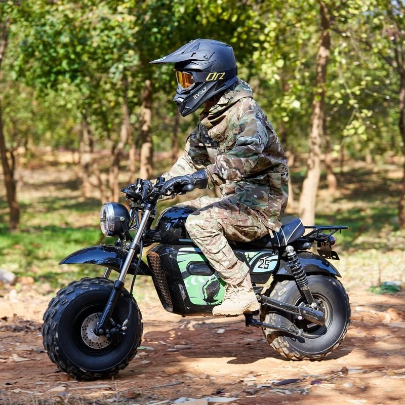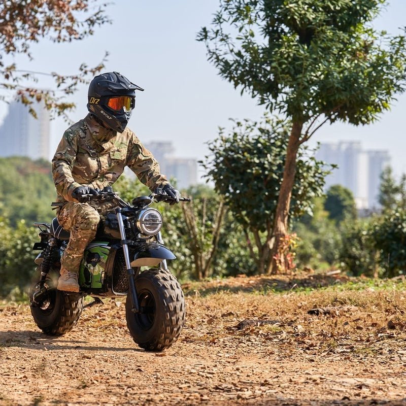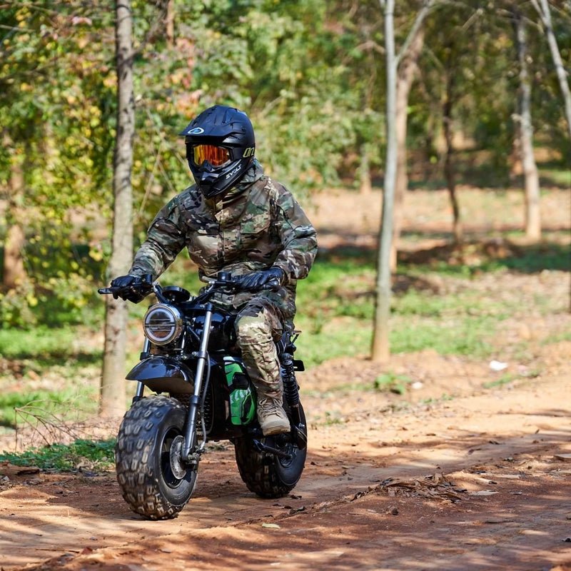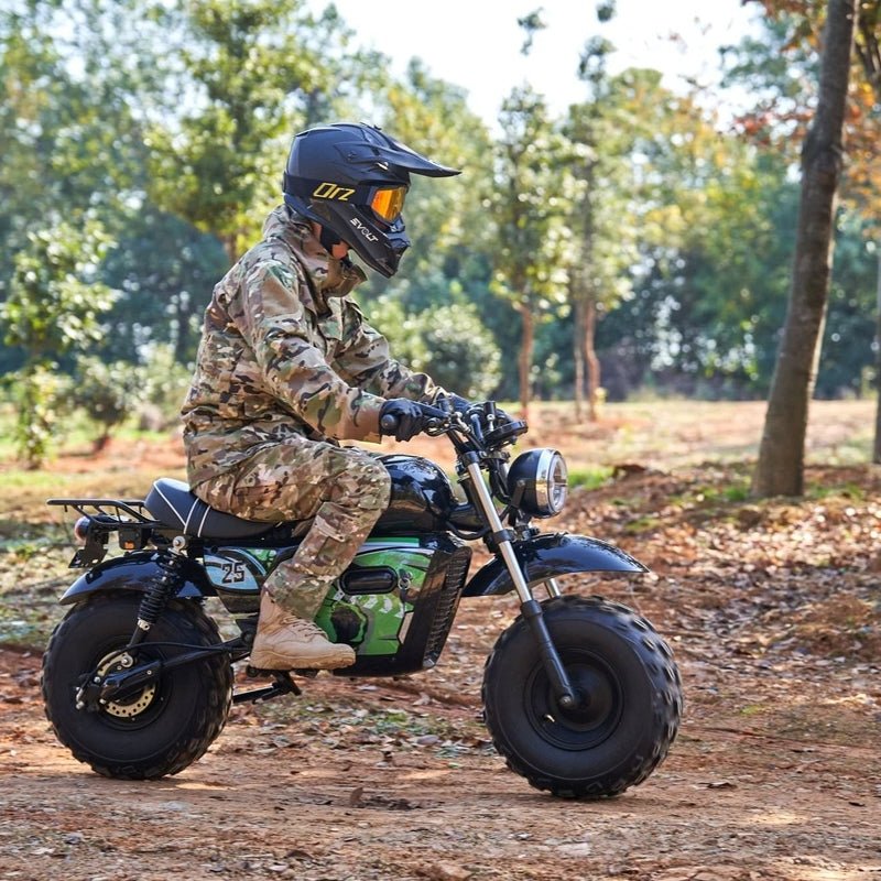 Just like the ones your parents used to drive, only safer and easier to use. Powered by a brushless 1500 watt electric hub motor, twist throttle for easy operation, large front headlight and key start. With it’s rugged steel frame and huge knobby tires, this mini bike is built tough to handle the roughest of terrain.