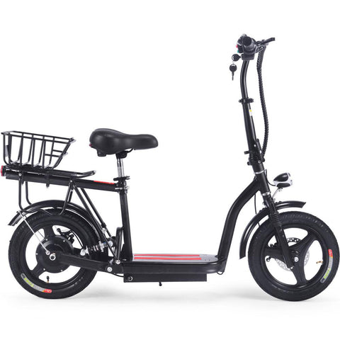 The MotoTec Cruiser Scooter features a gorgeous bare metal frame with a low deck. It comes with a headlight, a rear basket for luggage, and a comfortable saddle perfect for leisure and commuting. It features a folding handlebar tiller that makes storage and parking easy.