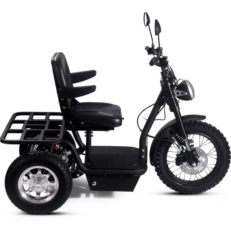 This a torque monster ready to conquer any terrain! This is a three-wheel electric scooter that you can ride while sitting or standing, this makes it very convenient for use at events, security and warehouse floor operations or for just plain fun! It’s like a three-wheel Segway but at a fraction of the price! Powered by a 1800 watt servo motor with speeds up to 18 miles per hour. It can achieve a 20+ mile range on a full charge. It features a 24 inch pneumatic front tire, two 18 inch pneumatic rear tires and a comfortable seat with a backrest and armrests. This personal transporter is easy-to-operate with a twist throttle and front/rear hydraulic brake system. Comes standard with front and rear suspension, key, battery meter lights, headlight, mirrors, reverse and carrying rack.